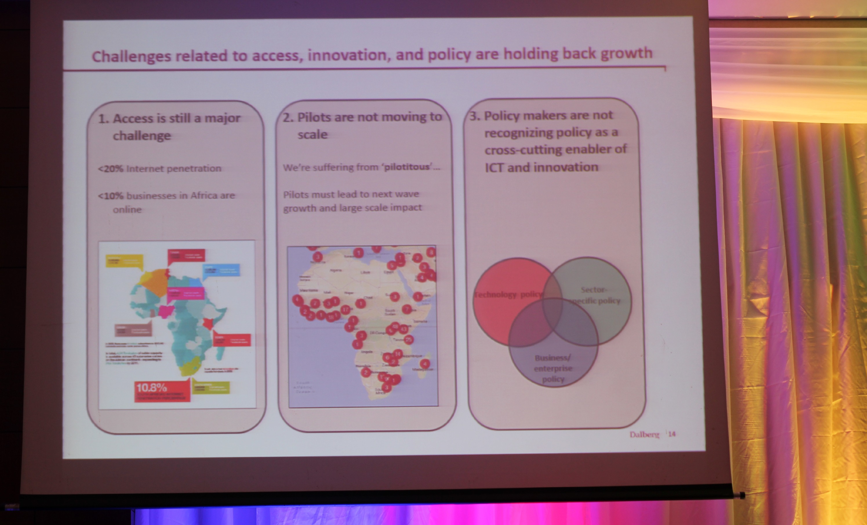 The largest problem that Dalberg found is that pilot internet projects are not scaling. It found that there are lots of pilots but these do not lead to mature growing businesses. Mairead placed the blame for this on investors who are keen to fund exciting new pilots but offer no support for growing a business. She called on the internet hubs to offer more concrete advice in this area.