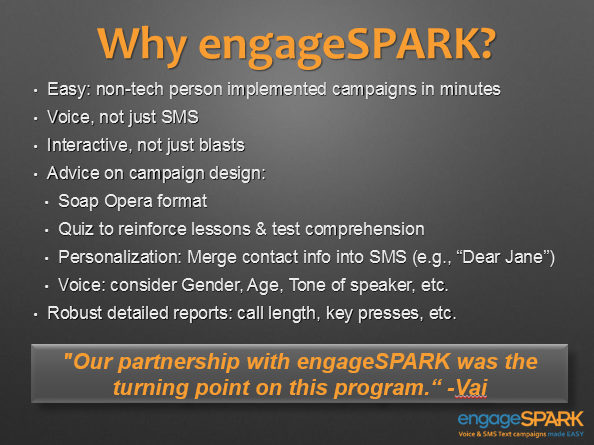 Vai continually stressed how easy it was to use engageSPARK, giving an anecdote of how she is amazed by Excel formulas to show how “non-techie” she is. Here is a slide about other reasons, as she puts it, “engageSPARK was the turning point on [the TabangKO] program.”