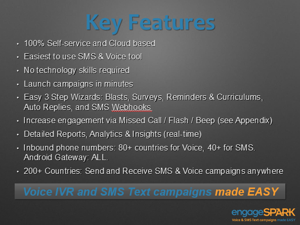engageSPARK is the easiest & quickest solution for SMS Text and Voice Call – blasts, surveys, reminders, alerts, and SMS auto replies. And the best part is that no technical skills are required to use our 3 step wizards: it takes just minutes to launch a campaign. Your account is free to create – the only cost is per message sent. So try it yourself!