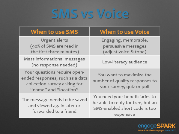 I wrote a blog post on when to use SMS vs Voice last month, but here is a summary from our Webinar slide deck: