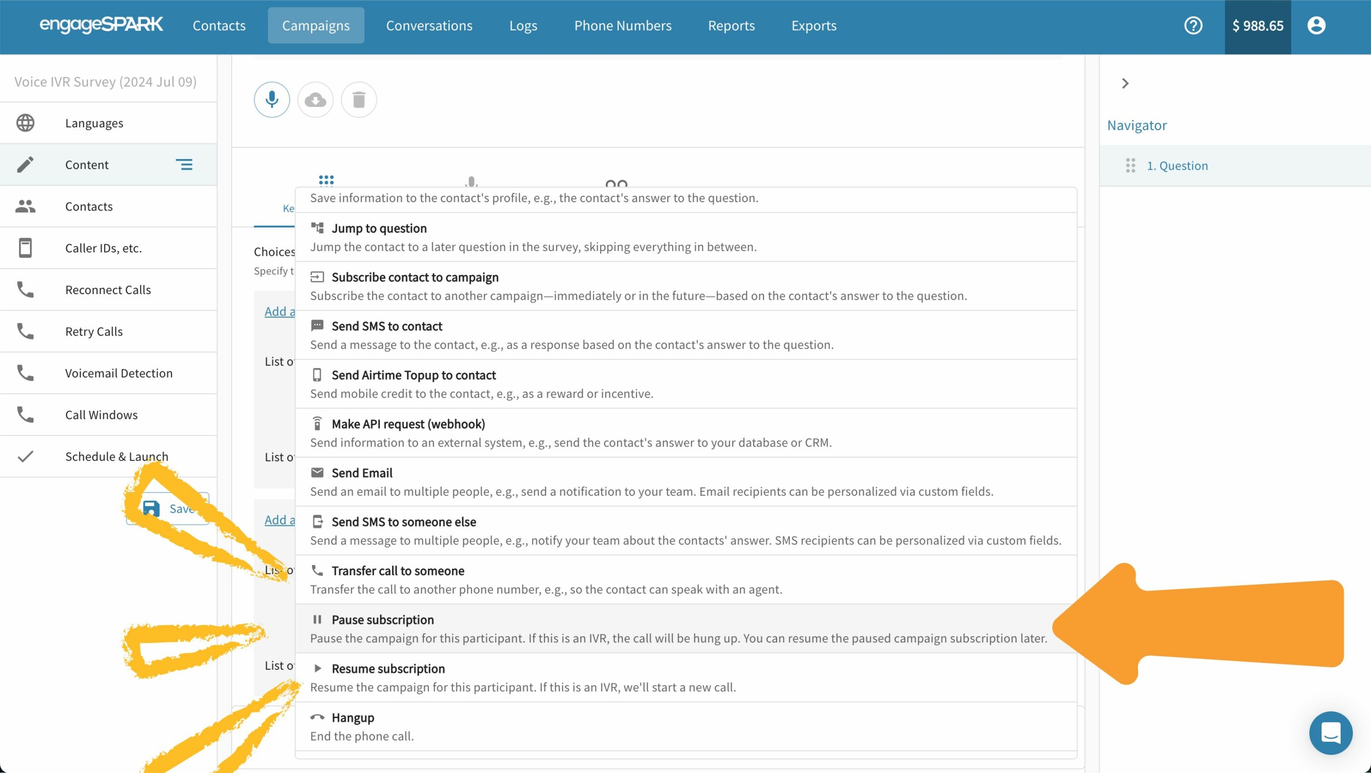 As you see in the picture above, you can now find the pause subscription action in any actions selector of a voice question.