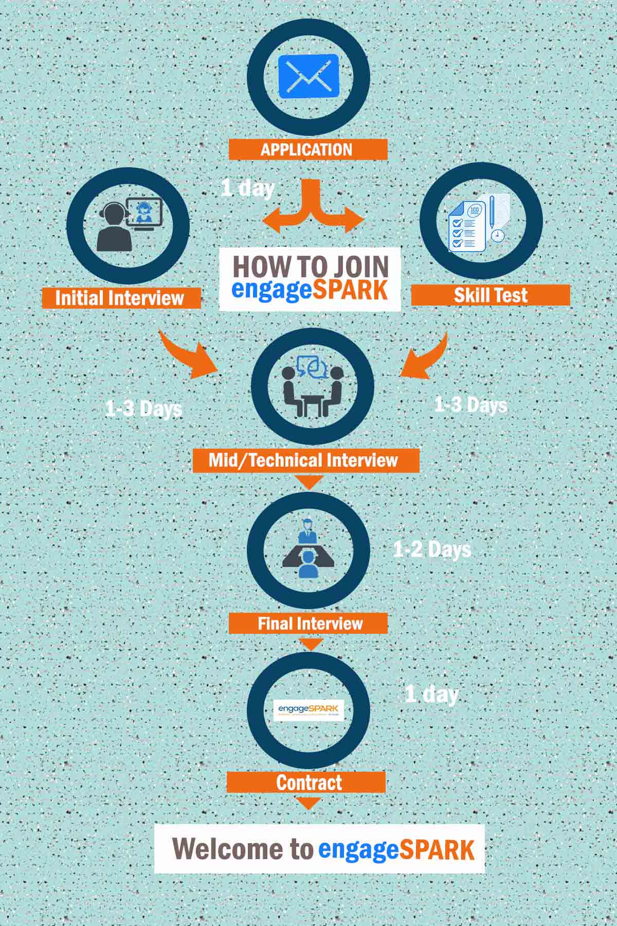 Hi, thanks for your interest in engageSPARK! We want your application to go as smoothly as possible, so it’s important that we set the right expectations. Have a look out our hiring workflow below to be guided. Please note that the time frames indicated here are only estimates and would depend on workload and other unforeseen circumstances. Please feel free to ask for updates by dropping a message at Jobs@engagespark.com or from the last person you spoke to in case we exceed those times.