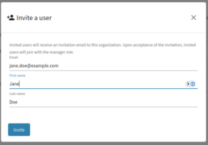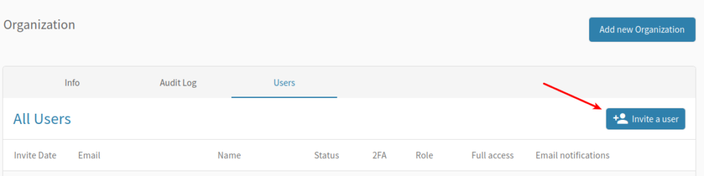 - Start by going to the Users tab of your Organization. On the top right, you’ll see a button to invite users. Click it and a modal opens.