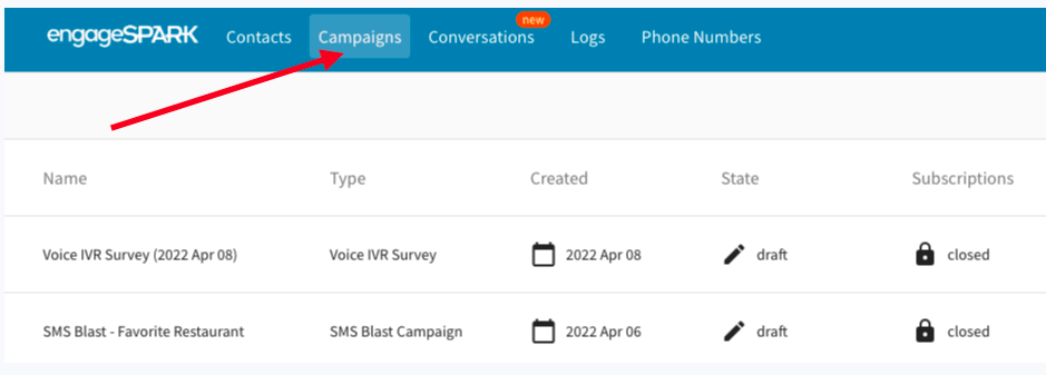 - Log in to your engageSPARK account and click the Campaigns page.