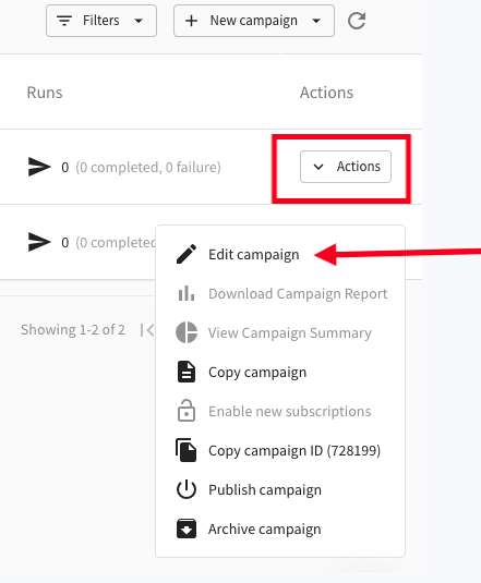 - Click the Actions button and choose Edit campaigns