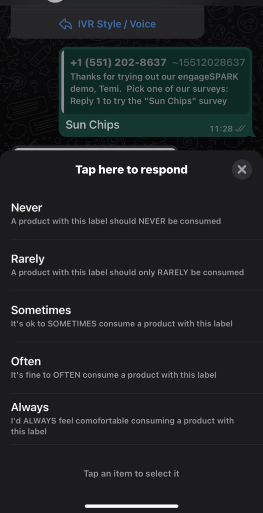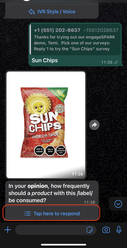 The engageSPARK platform now allows you to engage an even wider audience who are online – using WhatsApp Surveys. You can start using the platform to send our messages and survey questions to your contacts via the WhatsApp app on their phones. It is super powerful with options to switch from sending text-based messages, images with captions, or voice messages.