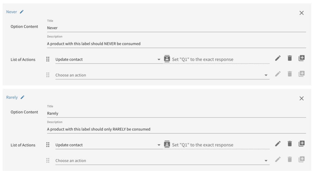 For each choice, you can add multiple actions. Actions are a powerful set of requests you want the system to do depending on a contact’s response to your question.