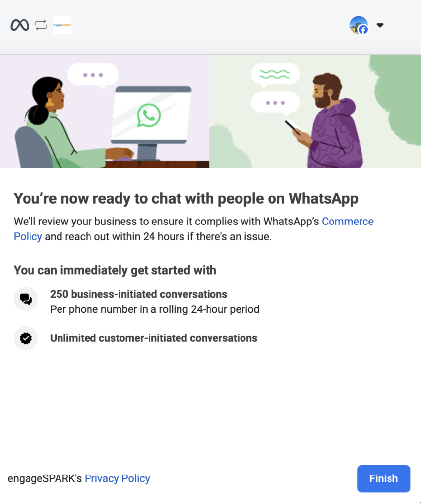 The admin of your FB Business Portfolio will be the one who will go through the process of connecting your Business Portfolio account to your engageSPARK account. You will need to add them as a user to your engageSPARK account, and we will guide them through the process.