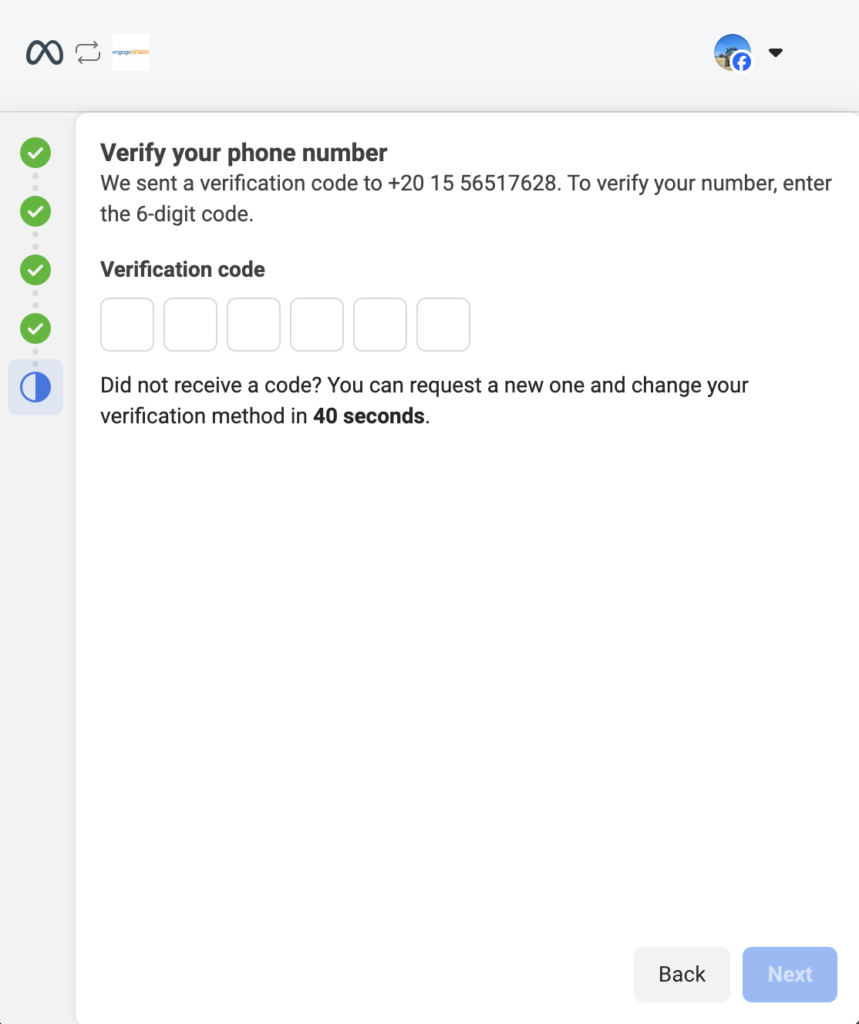5. Meta will send an OTP to the number you used to verify the number. So your admin needs to have access to this number to see the OTP or you can coordinate and send it to them when you receive it.