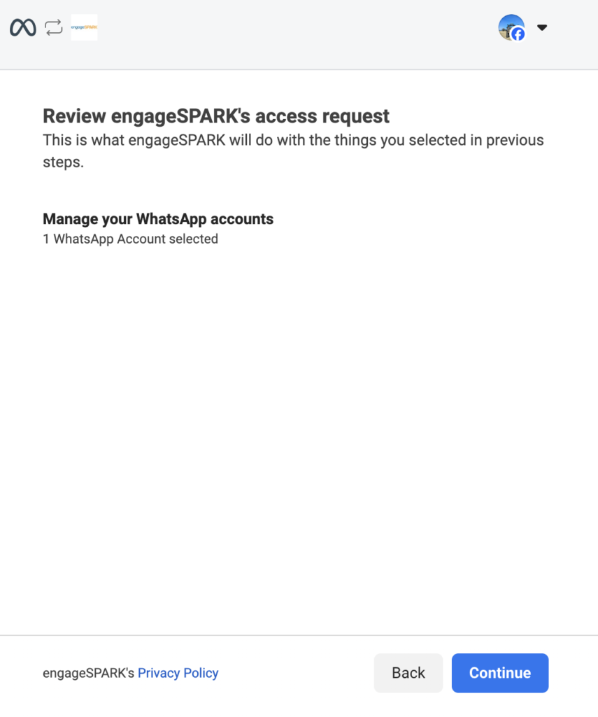The admin of your FB Business Portfolio will be the one who will go through the process of connecting your Business Portfolio account to your engageSPARK account. You will need to add them as a user to your engageSPARK account, and we will guide them through the process.